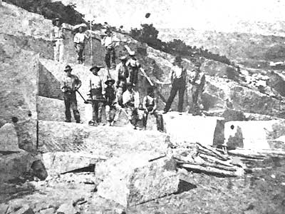 Workers at Mt. Waldo quarry, 1880 ... An 1859 lithograph shows the front wall under construction with three derricks, which were used to move the heavy stone blocks.