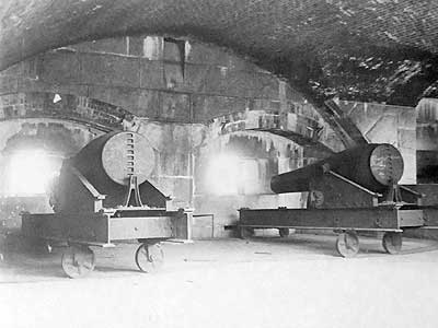 Battery A with many 10-inch and two larger 15-inch Rodmans. ... Fourteen 10-inch Rodmans arrived in 1866 for the interior casements. The sole surviving one was made in 1865 in Pittsburgh, Pennsylvania. (photo circa 1930)