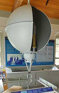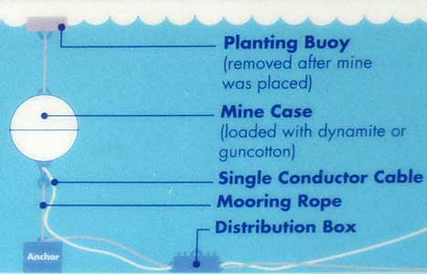This is a model of a buoyant submarine mine or torpedo. These were placed in the river between Fort Knox and Verona Island during the Spanish-American war in 1898. These were the most modern weapons against ships since they exploded the hulls. These kind did not explode on contact. They had to be detonated by someone on the shore.