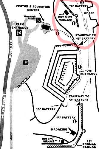 Battery B, with two Rodman cannons and an 1853 hot shot furnace. The furnace could heat cannonballs so that they could set fire to enemy ships. However, that was technology meant for the older cannons (which never arrived). The Rodmans could fire much larger cannonballs that were more effective against the new ironclad ships.
