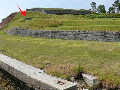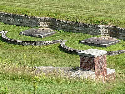 Designed to defend against cannon fire from attacking ships, these were massive, strong and heavily armed. They had a tier of casemates (large rooms with vaulted ceilings) with cannons along the waterfront wall and another level of cannon platforms on the roof. Ditches around the fort protected it from land attacks. Rifle ports allowed for crossfire into the ditch. Cannon ports were equipped with iron shutters which could be opened and then slammed shut after firing. Fort Knox was built on a slope, leading to an even more complicated design. However, enemy ships never appeared on the river here during this time and many of the cannon emplacements remained empty.