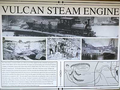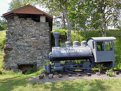 This Vulcan Steam locomotive was built in 1923 by Vulcan Iron Works and used for hauling stone in Pennsylvania. It was brought here in the 1970s to serve as a reminder of Rockport's industrial past. In 1887, the Rockport Railroad began transporting lime rock dug from local quarriers to the lime kilns here. Before this, horses and oxen pulled the loads of stone, often at the expense of their lives. The locomotives could haul 30 cars, each loaded with 11,000 pounds of limestone. By the end of the 1890s, the use of limestone in building national structures had declined, thanks to the invention of cement. A fire in 1907 destroyed the kilns. Eventually the two original engines were sold for scrap.