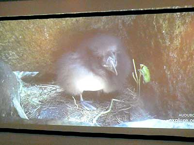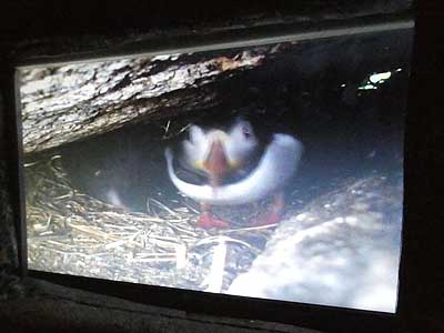 A video of a baby puffin exploring its nest played on a screen on the wall