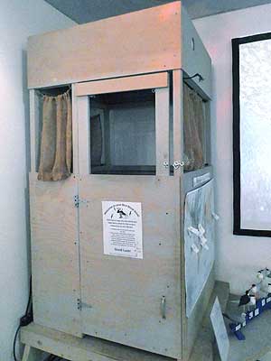(right) Bird blinds are used by observers for up to six hours a day, sitting in very cramped conditions. There's no electricity for temperature control.