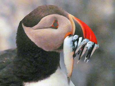 While most puffins tend to carry 3 to 6 small fish in their beak, 15 fish isn't uncommon. The recorded record is 62 fish in one load!