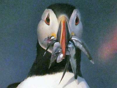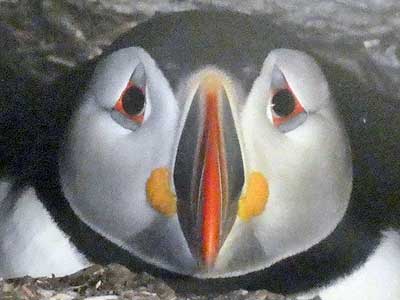 Puffin vision is specialized for underwater hunting, with their eyes angled slightly upward and with a broad visual field, adapted for spotting small fish. Their colorful faces become duller in the winter.