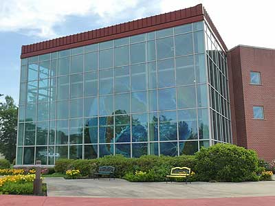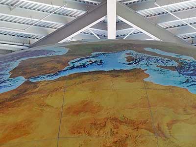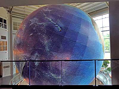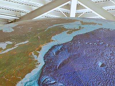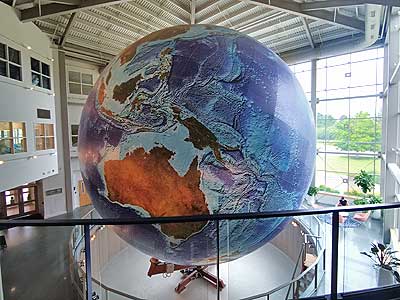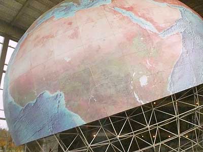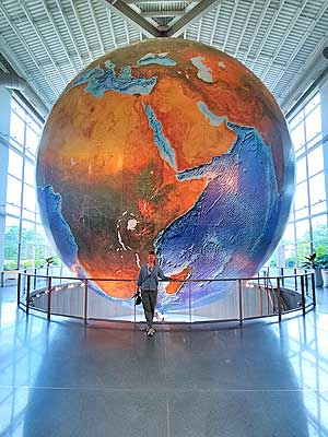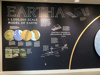 Completed in 1998, the EARTHA globe was the largest printed image of the Earth ever created. It is a one to one-million scale model and is 42 feet in diameter. One inch represents 16 miles, and one 18-minute revolution equates to a day. It tilts at 23.5 degrees, the same as the planet itself.