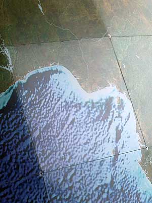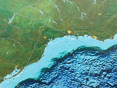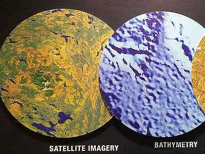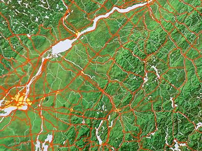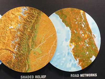 It is a composite built from satellite imagery (using multi-spectral imagery), shaded relief (indicating elevation change on land), colored bathymetry (ocean depth data) and information about road networks and urban areas.