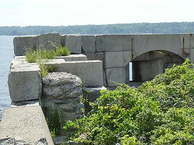 Fort Gorges was one of three forts in Portland Harbor (the others being Fort Prebel and Fort Scammel). But while both Preble and Scammel were completed in 1808 as part of the Second System of US fortifications, Fort Gorges was built as part of the Third System. Construction began in 1858 and the Civil war broke out in 1861. The chief architect was Thomas Lincoln Casey (also from Fort Knox). The D-shaped, two-story, enclosed fortress was constructed entirely with local granite and had 56 gun emplacements.