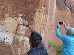 Day 2 - We get on the road early. After enjoying the Salt Wash View Area and the Spotted Wolf Canyon View Area (with views of the San Rafael Swell), we arrive in Green River to give our greetings to the Sinclair dinosaur. After lunch, we continue on to Canyonlands, where we hike to Mesa Arch, stroll along the rim at Grand View Point, and get one last scenic look at the Green River Overlook. We stop at the Potash Petroglyphs on the way to our hotel in Moab.