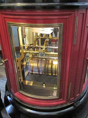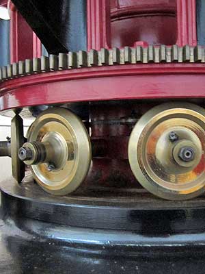 The original clockwork mechanism embedded in the cast iron housing and... the large rotating wheels at the bottom