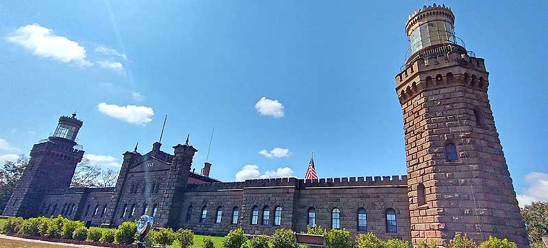 The Navesink Twin Lights are a pair of lighthouses located 246 feet above sea level on the headlands of the Navesink Highlands. A pair of beacons have existed here since 1828 to help ships navigate the treacherous entrances to New York Harbor. The current structure was constructed in 1862. Each tower had a different light... one flashing and one fixed. In 1898, the north tower light was discontinued while the south tower was electrified. It was automated in 1949 but discontinued in 1952 as its importance diminished. It was acquired by the state in 1962.