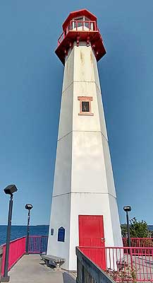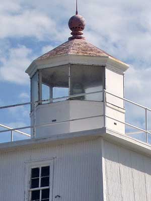 The Harbor of Refuge Inner Lighthouse is one of a pair of lighthouses built on the west pier at the entry to Grand Marais Harbor of Refuge. In the 1870s, shipping traffic began to drastically increase in Lake Superior. So in 1881, the harbor at Grand Marais was upgraded. A shipping canal was dredged and a 5,770-foot breakwater was constructed. It was decided that navigation into the harbor would be much safer with a pair of lights. In 1895, a prefabricated, 34-foot, cast-iron light was placed at the outer end of the pier. A 55-foot-tall inner or rear range light was added in 1898. This one still retains its 5th order Fresnel lens while the outer range light has been replaced with a modern acrylic lens.
