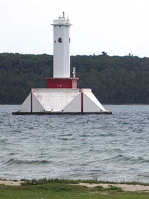 The Round Island Passage Light, located in the Round Island Channel in the Straits of Mackinac, is an unmanned lighthouse built in 1948. Underwater power cables were run from a control house at the southern tip on Mackinac Island. It was equipped with a beacon light, fog signal and radiobeacon. It was built at the same time that the main lighthouse was deactivated. The red color was added in 1968 and it was completely automated in 1973.