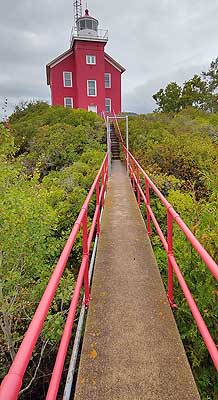 The discovery of iron deposits just west of the town in 1844 led to the development of the area. Its importance earned it a lighthouse in 1853, even before the opening of the Soo Locks in 1855 which multiplied the shipping traffic on the lake.The 26-foot-tall stone tower received a 6th order Fresnel lens in 1856 to replace the array of lamps and reflector. Unfortunately due to the extreme weather of the area, it had to be rebuilt in 1866. In 1870, a 4th order lens (that illuminated an arc of 270 degrees) replaced the previous lens, which had an arc of just 180 degrees. It was electrified in 1921 and painted red in 1965.