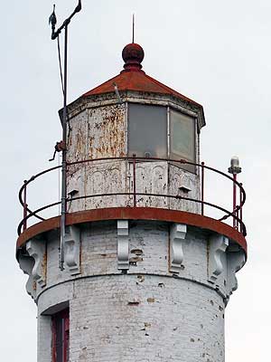 Built in 1870, the Sturgeon Point Lighthouse tower stands nearly 71 feet tall. A covered passageway connects the tower to the keeper's house. A spiral stairway leads up the cast-iron lantern room, which came from a lighthouse in Oswego, New York. Originally a 3.5 order Fresnel lens was used and could be seen for up to 15 miles. The lens was somehow damaged in 1887 and new one was installed. It was automated in 1939.
